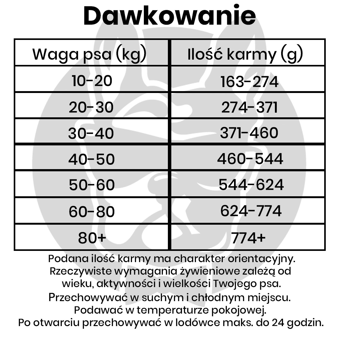 białko surowe 26,0%; tłuszcz surowy 16,0%; popiół surowy 7,5%; włókno surowe 2,5%; wilgotność 9,0%; wapń (Ca) 1,8%; fosfor (P) 1,1%; omega-6 - 1,6%; omega-3 - 1%