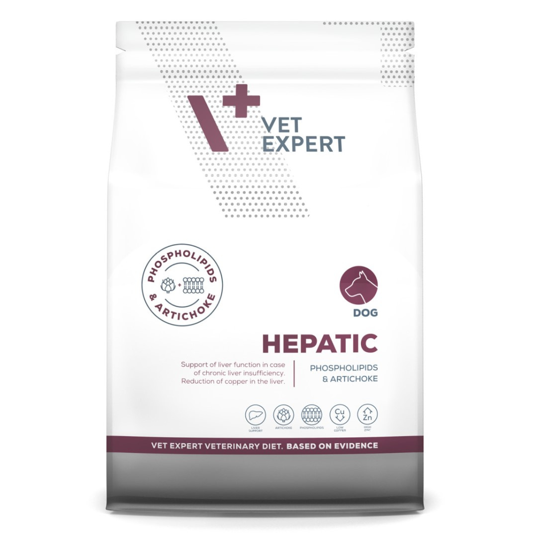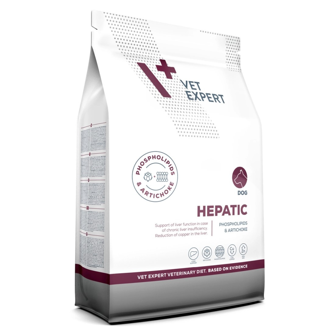 Dieta Hepatic Dog to jedyna na świecie karma z unikatowym składem, zawierająca karczocha i fosfolipidy, które posiadają udowodnione działanie wspomagające funkcje wątroby w przypadku jej niewydolności. To pełnowartościowa, pełnoporcjowa karma dietetyczna dla psów, podawanie której wspomaga czynności wątroby w przypadkach jej przewlekłej niewydolności oraz pozwala na ograniczenie odkładania się miedzi w wątrobie. Zawiera umiarkowany poziom wysokiej jakości białka (pochodzącego z drobiu, kukurydzy, ryżu), wysoki poziom niezbędnych nienasyconych kwasów tłuszczowych, wysokostrawne węglowodany oraz niski poziom miedzi.