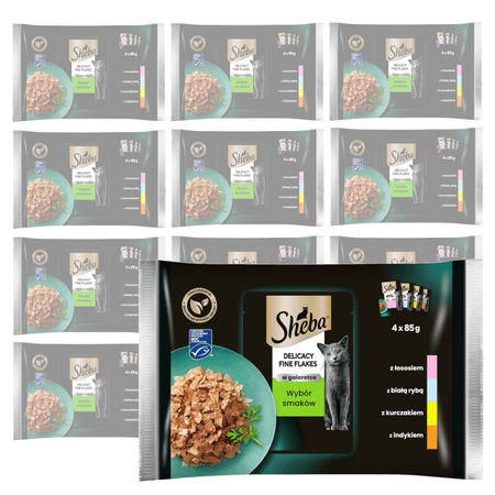 Mokra karma dla kota SHEBA® Fine Flakes in Jelly Kolekcja Smaków to zestaw 4 saszetek, z wybornymi smakami: z białą rybą, z łososiem, z indykiem, z kurczakiem. W każdej porcji znajduje się luksusowa mieszanka starannie przygotowanych płatków karmy w delikatnej galaretce. Wystarczy, że kot raz jej posmakuje, a na pewno będzie miał ochotę na więcej.