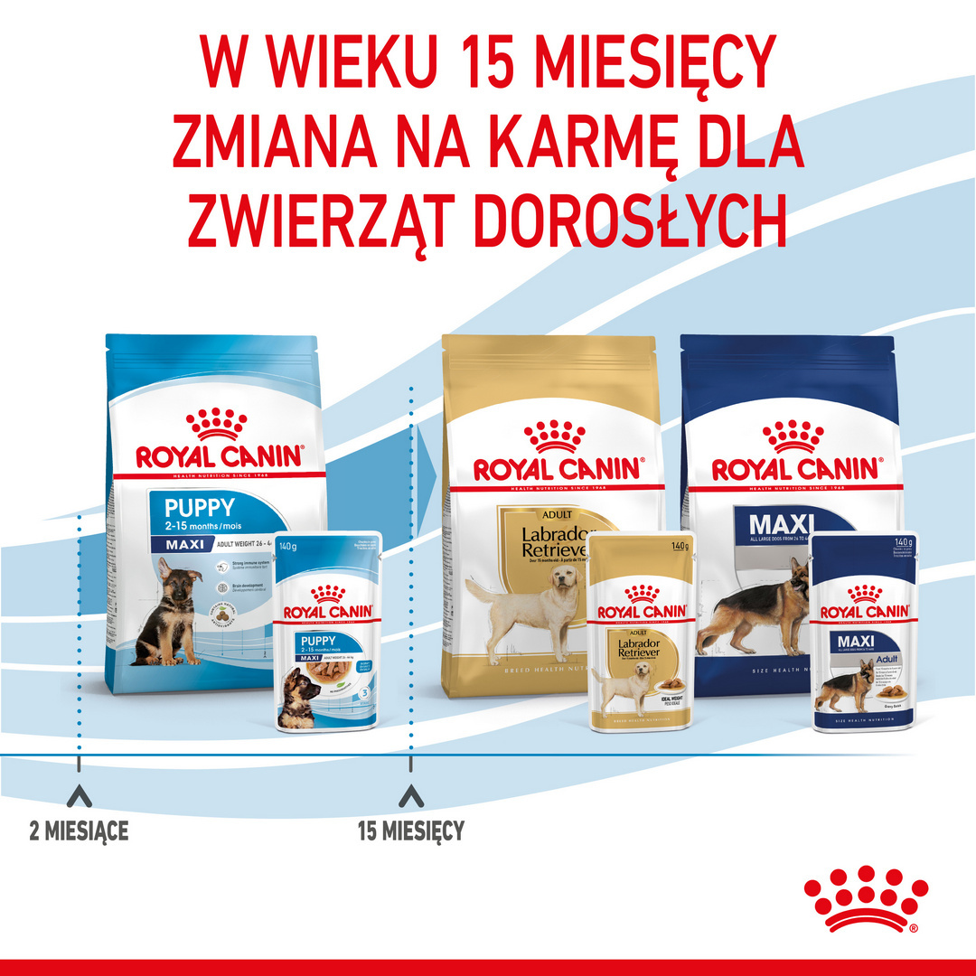 Karma mokra ROYAL CANIN® Maxi Puppy w sosie została specjalnie opracowana, aby pokrywać w pełni potrzeby pokarmowe szczeniąt ras dużych. Karma jest przeznaczona dla szczeniąt w wieku od 2 do 15 miesięcy, które po zakończeniu wzrostu osiągną masę ciała 26-44 kg