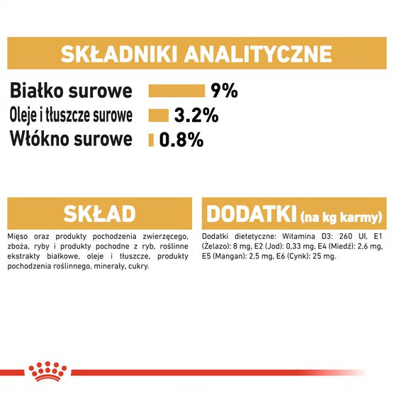 Karma mokra ROYAL CANIN® British Shorthair Adult charakteryzuje się umiarkowanym poziomem energii oraz dostosowanym poziomem tłuszczu (3,2%), co sprzyja utrzymaniu optymalnej masy ciała.