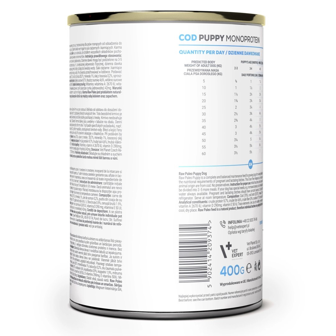 Raw Paleo Puppy jest pełnoporcjową karmą bytową przeznaczoną dla psów rosnących od odsadzenia do osiągnięcia dojrzałości (około 1 roku życia). Spełnia także wymagania suk ciężarnych i karmiących. Karma nie zawiera zbóż (Grain Free) i jest jednobiałkowa, co oznacza, że źródłem wszystkich składników pochodzenia zwierzęcego jest dorsz.