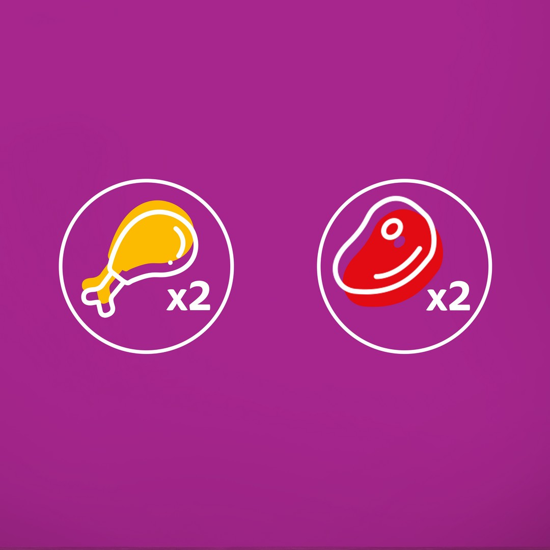 Kawałki z kurczakiem - skład: mięso i produkty pochodzenia zwierzęcego (21%, 100% naturalne*; w tym kurczak 4% w kawałkach**), roślinne ekstrakty białkowe, substancje mineralne (0,7%), cukry, produkty pochodzenia roślinnego. *Składniki naturalnego pochodzenia. **Kawałki zwykle stanowią 33% produktu.