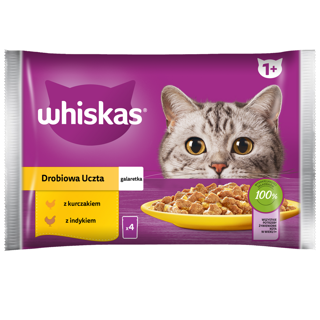 Nasze posiłki Whiskas Drobiowa Uczta w galaretce zostały specjalnie przygotowane tak, aby zachować naturalne wartości odżywcze i smak wysokiej jakości składników. Sprawią, że Twój kot przybiegnie do miski szybciej niż kiedykolwiek wcześniej!