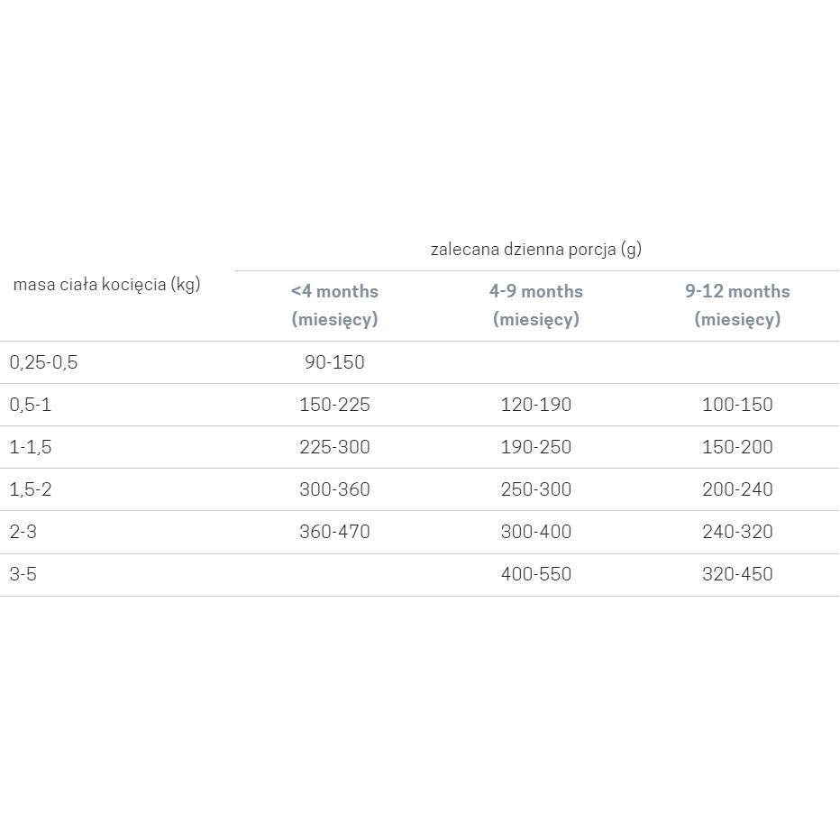 Podana ilość karmy ma charakter orientacyjny. Rzeczywiste wymagania żywieniowe zależą od wieku, aktywności i wielkości Twojego kota.