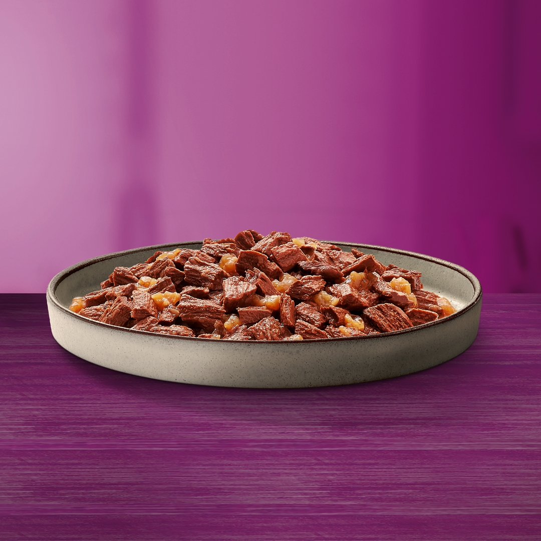 Kawałki z wołowiną. Skład: mięso i produkty pochodzenia zwierzęcego (20%, 97% naturalnego pochodzenia*; w tym wołowina 4% w kawałkach**), roślinne ekstrakty białkowe, substancje mineralne (0,7%), cukry, produkty pochodzenia roślinnego.