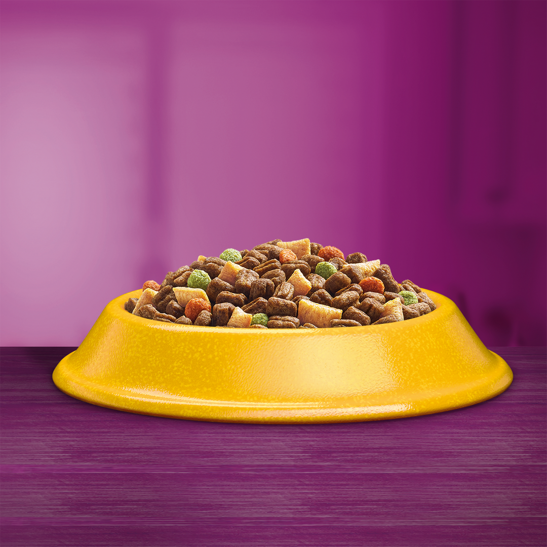 Skład: zboża, mięso i produkty pochodzenia zwierzęcego (w tym 4% kurczaka w brązowych granulkach*), oleje i tłuszcze, roślinne ekstrakty białkowe, produkty pochodzenia roślinnego, substancje mineralne, warzywa (w tym 0,5% suszonej marchewki co odpowiada 4% marchewki w pomarańczowych granulkach i 1% suszonego groszku co odpowiada 4% groszku w zielonych granulkach*), cukry, drożdże.