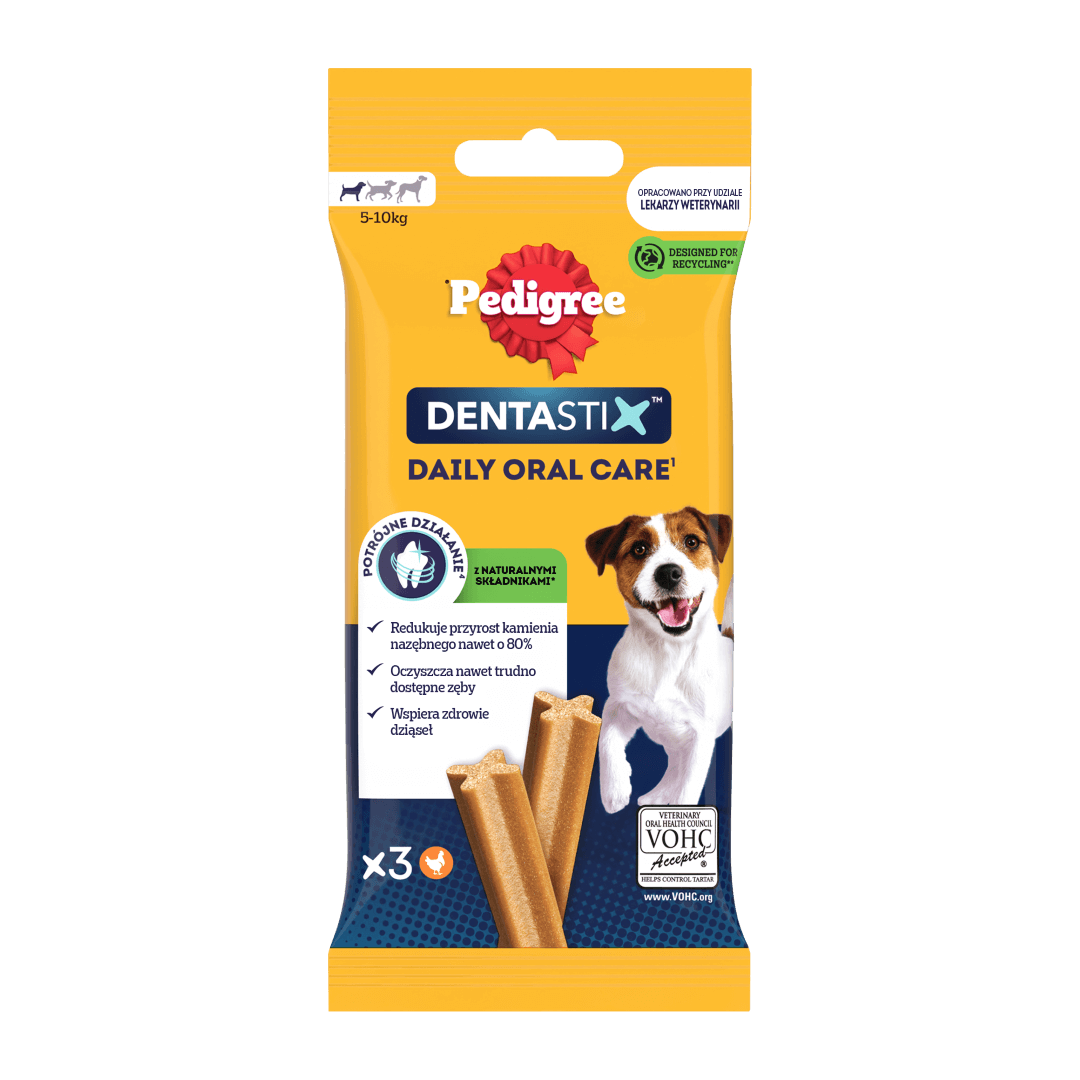 Pedigree DentaStix to smaczny przysmak dentystyczny o unikalnym kształcie X i specjalnej powierzchni ściernej dla psów średnich ras. Podawany codziennie ogranicza powstawanie kamienia nazębnego nawet do 80%, co zostało udowodnione badaniami naukowymi. Przysmaki Pedigree DentaStix posiadają strukturę o delikatnych właściwościach ścierających i aktywne składniki, które pomagają ograniczać gromadzenie się osadu i kamienia nazębnego. Dodatkowo, DentaStix zostały opracowane tak, aby Twój pupil długo je żuł, co zwiększa ich skuteczność. Przysmak Pedigree DentaStix ma niską zawartość tłuszczu, nie zawiera sztucznych barwników, aromatów ani dodatku cukru.