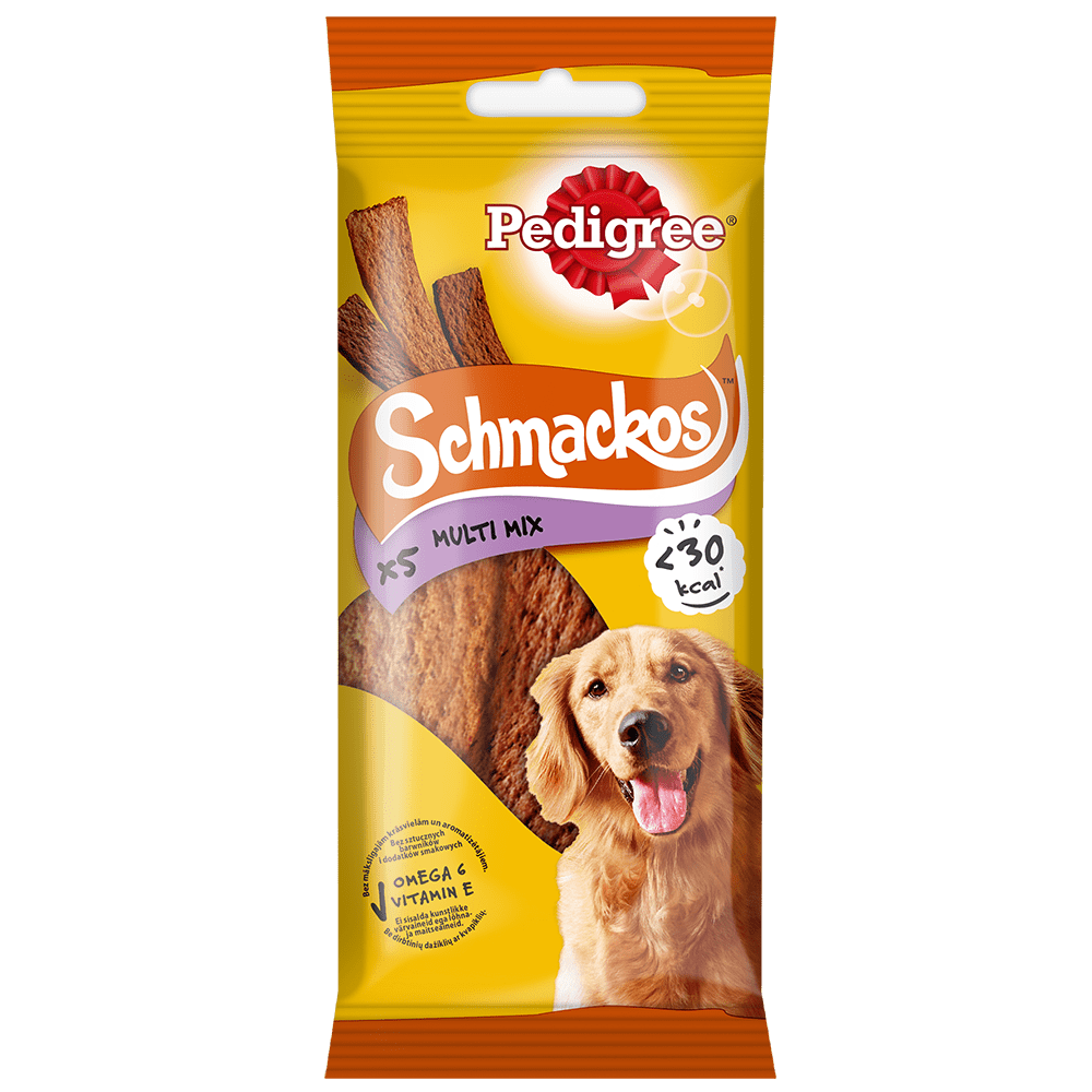 PEDIGREE® SchmackosTM Multi Mix to mięsiste paski w 3 pysznych smakach: wołowiny, jagnięciny i drobiu, które sprawią Twojemu psu przyjemność. Z tą przekąską skutecznie troszczysz się o zdrowie i witalność pupila. Przysmak jest bogaty w witaminy i kwasy Omega-6, które pomogą utrzymać Twojego psa w dobrej formie przez całe życie.