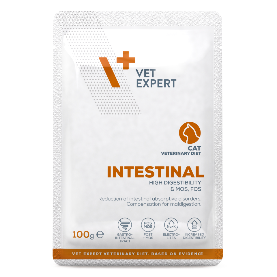 Pełnoporcjowa i zbilansowana karma dietetyczna, zalecana do stosowania w zaburzeniach trawienia i wchłaniania oraz w przypadku chronicznej niewydolności trzustki. Karma dietetyczna Intestinal Cat cechuje się wysoką zawartością łatwostrawnych białek oraz wysoką strawnością składników pokarmowych. Dzięki tym cechom może być również stosowana w okresie rekonwalescencji. Zwiększony poziom sodu i potasu ogranicza straty tych pierwiastków w zaburzeniach trawienia i wchłaniania jelitowego.
