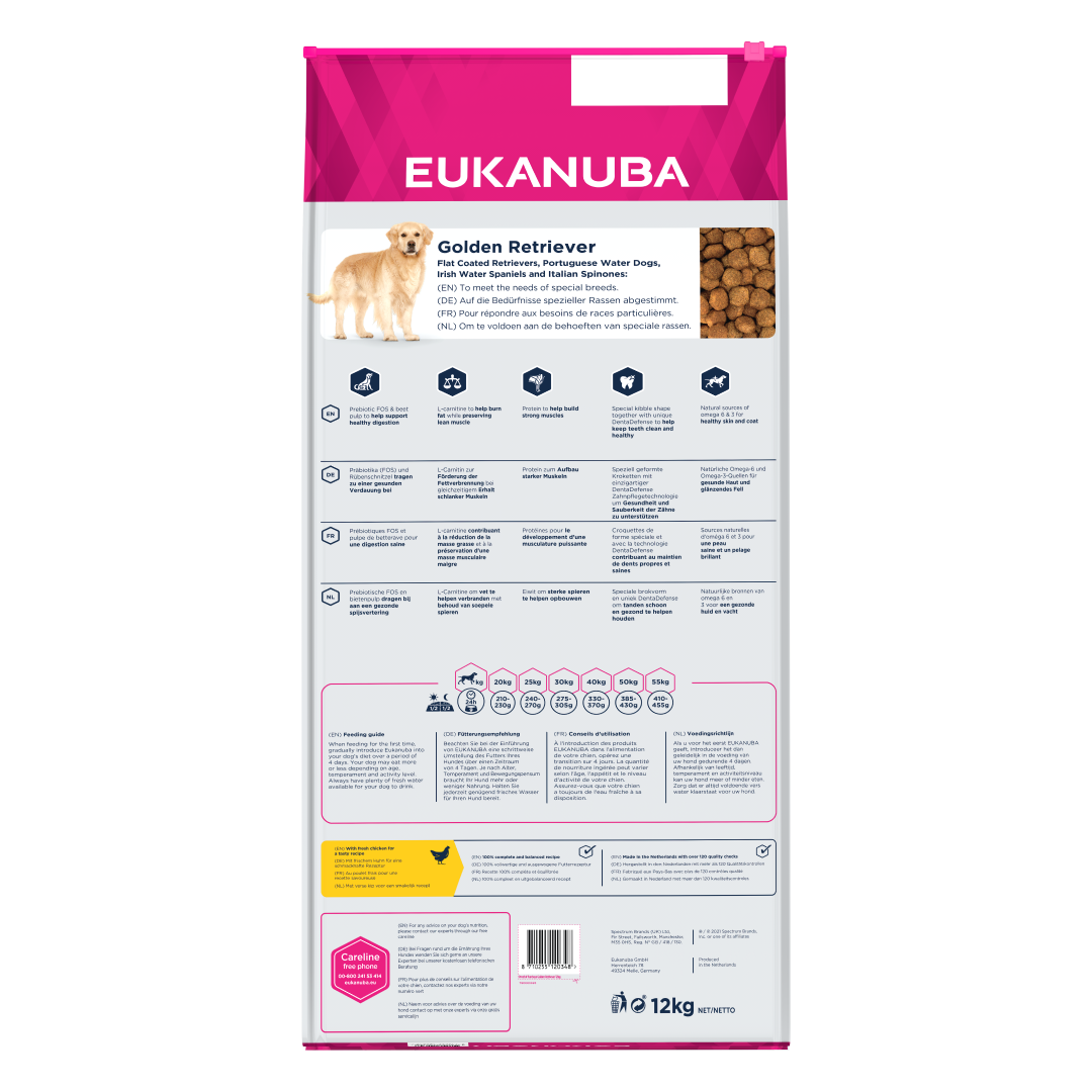 Sucha karma EUKANUBA dla dorosłych psów rasy Golden Retriever jest idealna także dla psów rasy flat coated retriever, portugalski pies dowodny, irlandzki spaniel dowodny i wyżeł włoski szorstkowłosy. Wysoka zawartość białka wspomaga budowę silnych mięśni. EUKANUBA Breed Specific zapewnia optymalny poziom L-karnityny, która w naturalny sposób wspomaga spalanie tłuszczu i prawidłowe trawienie. Zawartość prebiotyków i pulpy buraczanej wspomaga maksymalne wchłanianie składników odżywczych, a dodatek kwasów Omega-6 i Omega-3 zapewnia zdrowie skóry i lśniącą sierść.