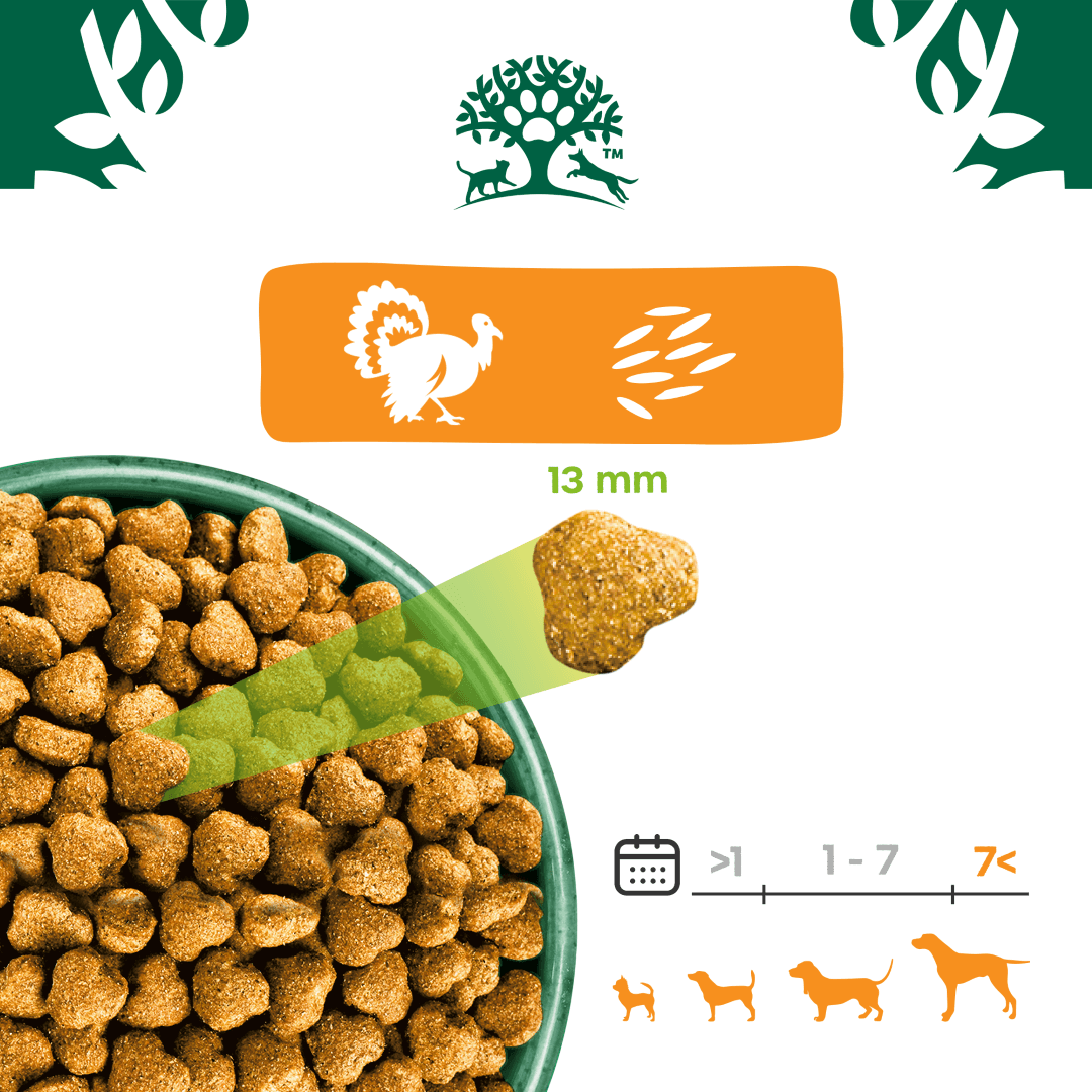 Skład: brązowy ryż* (26%), suszone białko z indyka* (17,5%), owies nagi*, jęczmień*, biały ryż* (10%), całe siemię lniane* (4%), tłuszcz drobiowy*, wysłodki buraczane*, sos z indyka, mączka z lucerny*, włókno z groszku*, wodorosty* (0,5%), substancje mineralne, olej z ryb, pokrzywa*, pietruszka*, ekstrakt z cykorii* (0,1%), glukozamina (0,045%), ekstrakt z jukki* (0,02%), chondroityna (0,005%). *Składnik naturalnego pochodzenia. Wyprodukowano w zakładzie przetwarzającym zboża i inne źródła białka.