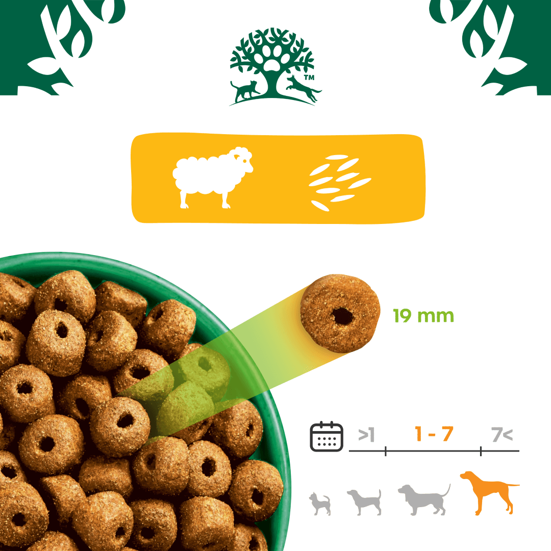 Skład: suszone białko jagnięce* (25%), jęczmień*, brązowy ryż* (13%), biały ryż* (13%), owies nagi*, tłuszcz drobiowy*, białko grochu, całe siemię lniane* (3,5%), sos jagnięcy, wysłodki buraczane*, mączka z lucerny*, włókno z groszku*, wodorosty* (0,5%), substancje mineralne, olej z ryb, pokrzywa*, pietruszka*, ekstrakt z cykorii* (0,1%), glukozamina (0,045%), ekstrakt z jukki* (0,02%), chondroityna (0,005%). *Składnik naturalnego pochodzenia. Wyprodukowano w zakładzie przetwarzającym zboża i inne źródła białka.