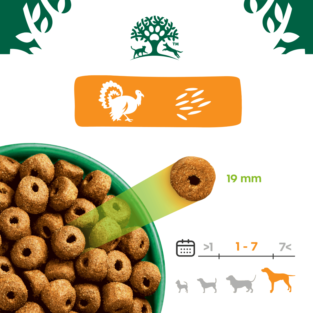 Skład: suszone białko z indyka* (25%), owies nagi*, brązowy ryż* (13%), biały ryż* (13%), tłuszcz drobiowy*, jęczmień*, całe siemię lniane* (3,5%), sos z indyka, wysłodki buraczane*, włókno z groszku*, mączka z lucerny*, białko grochu, wodorosty* (0,5%), substancje mineralne, olej z ryb, pokrzywa*, pietruszka*, ekstrakt z cykorii* (0,1%), glukozamina (0,045%), ekstrakt z jukki* (0,02%), chondroityna (0,005%). *Składnik naturalnego pochodzenia. Wyprodukowano w zakładzie przetwarzającym zboża i inne źródła białka.