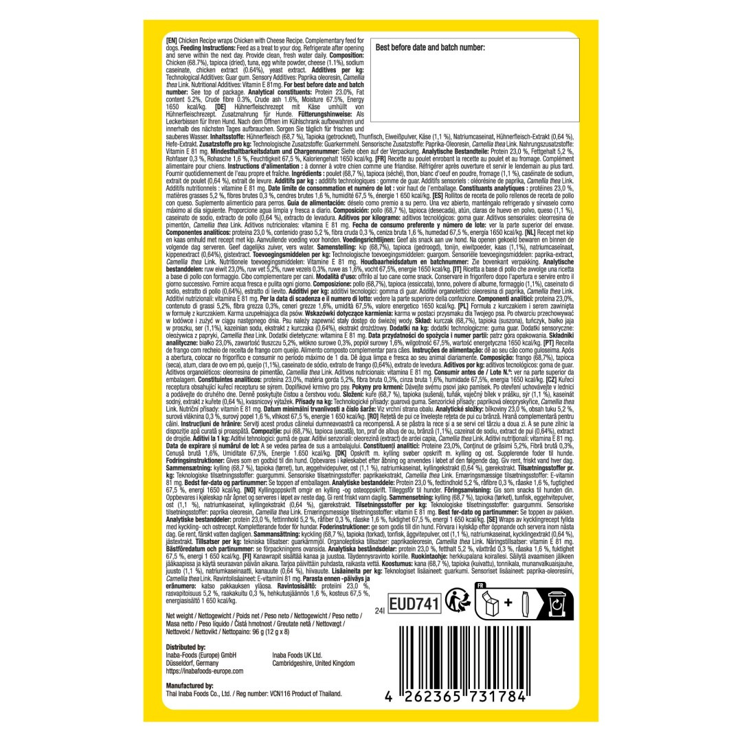Uzupełniająca karma dla psów. Formuła z kurczakiem i serem zawinięta w formułę z kurczakiem.