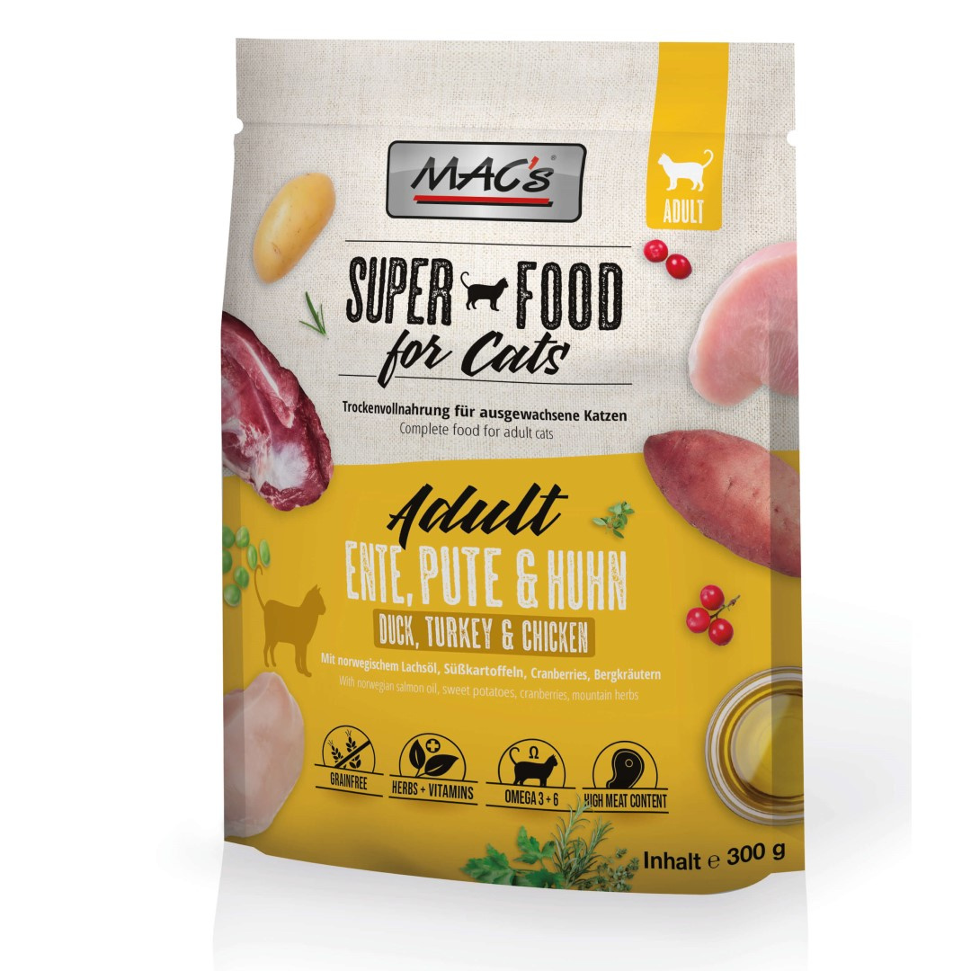 Karma MAC'S Adult Duck, Turkey & Chicken poprawia samopoczucie Twojego kota. Olej z łososia norweskiego jest bogaty w kwasy tłuszczowe omega i sprzyja lśniącej sierści. Żurawina jest naturalnym źródłem kwasów i pomaga zapobiegać bakteryjnym infekcjom pęcherza moczowego.