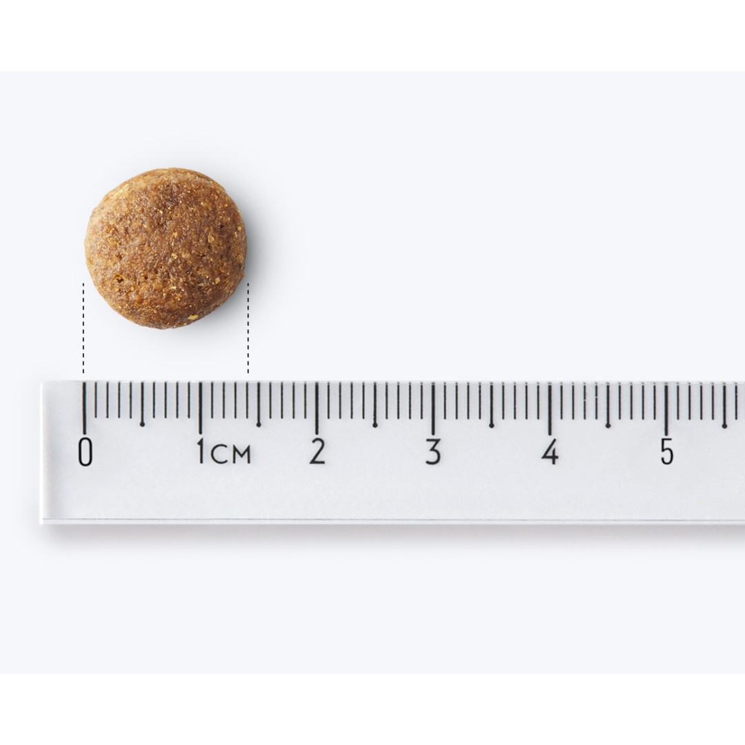 Karmę pełnoporcjową należy podawać zgodnie z zaleceniami dawkowania dostosowanymi do masy ciała, wieku i aktywności szczenięcia. Granulki w kształcie dysków wielkości 12-14 mm zostały zaprojektowane z myślą o szczeniętach większych ras, ułatwiając żucie i trawienie młodym psom. Przy zmianie karmy zaleca się stopniowe wprowadzanie przez okres 7-10 dni, stopniowo zwiększając proporcje nowego produktu. Szczenię powinno mieć stały dostęp do świeżej wody pitnej. W okresie wzrostu zaleca się podawanie karmy częściej w mniejszych porcjach.