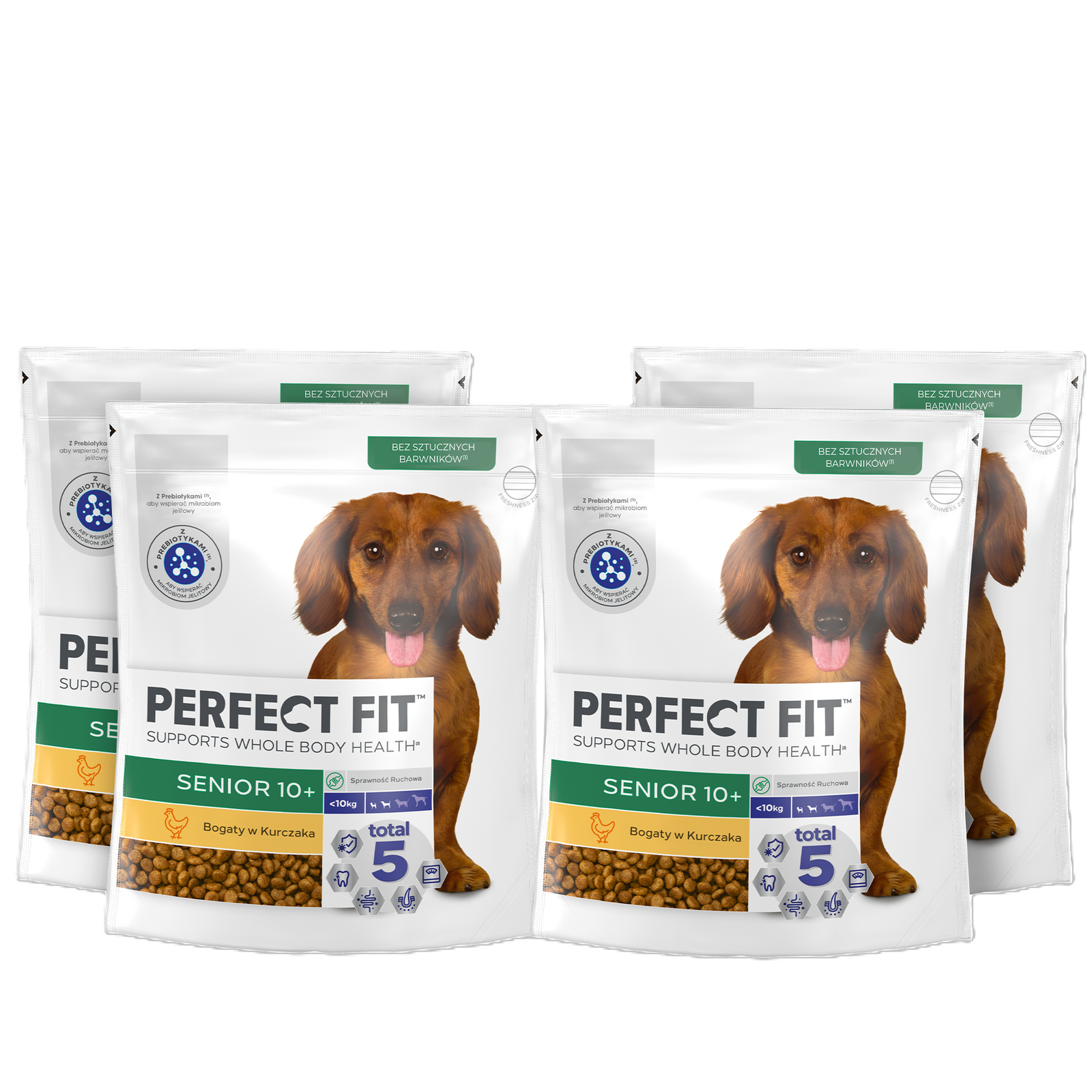 Receptura Perfect Fit™ Senior 10+ została opracowana we współpracy z lekarzami weterynarii oraz specjalistami ds. żywienia z Instytutu Nauki o Zwierzętach WALTHAM™, aby dostarczyć niezbędne składniki odżywcze starszym psom. Tak jak inne warianty, również pokarm Perfect Fit™ Senior 10+ bogaty w kurczaka dostarcza dodatkowe korzyści: wspiera sprawność ruchową oraz zawiera prebiotyki, aby dbać o mikrobiom jelitowy.