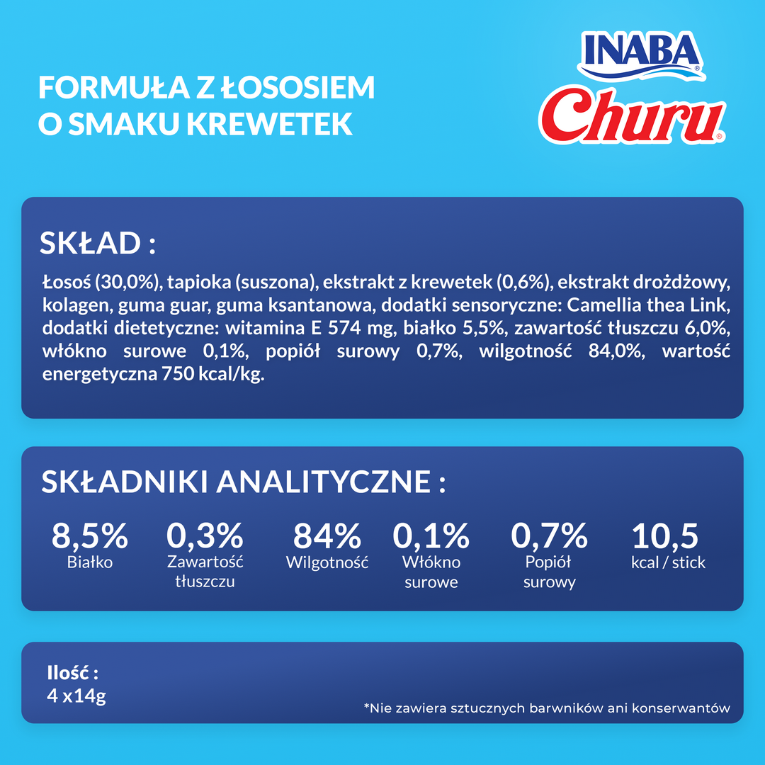 Przekąski Churu® są nie tylko smaczne i zdrowe, ale również niskokaloryczne. Idealnie sprawdzą się przy podawaniu tabletek. Są doskonałą nagrodą podczas szkolenia. Mogą być stosowane również jako dodatek do mokrych i suchych karm.