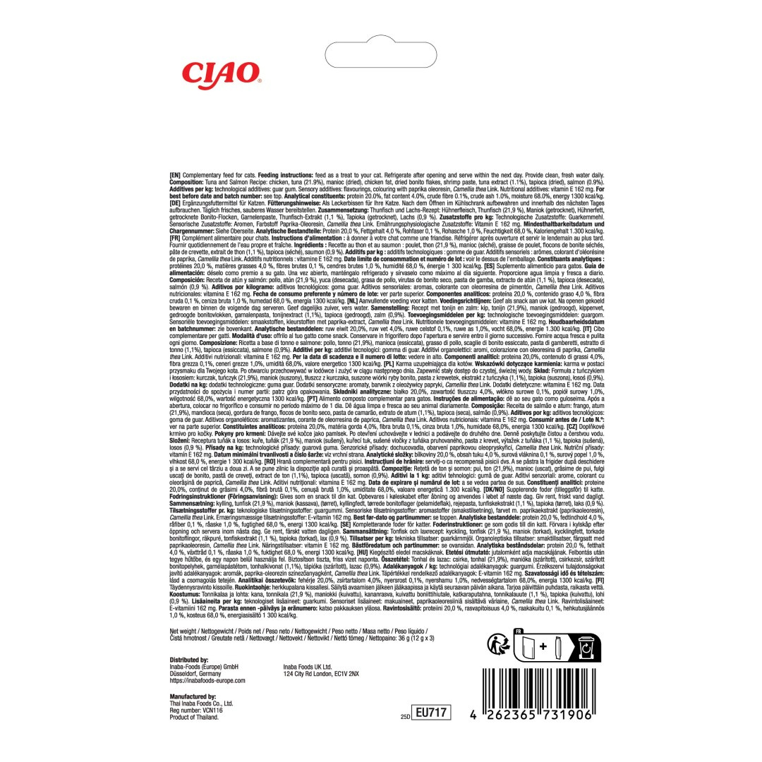 Skład: kurczak, tuńczyk (21,9%), maniok (suszony), tłuszcz z kurczaka, suszone wiórki ryby bonito, pasta z krewetek, ekstrakt z tuńczyka (1,1%), tapioka (suszona), łosoś (0,9%).