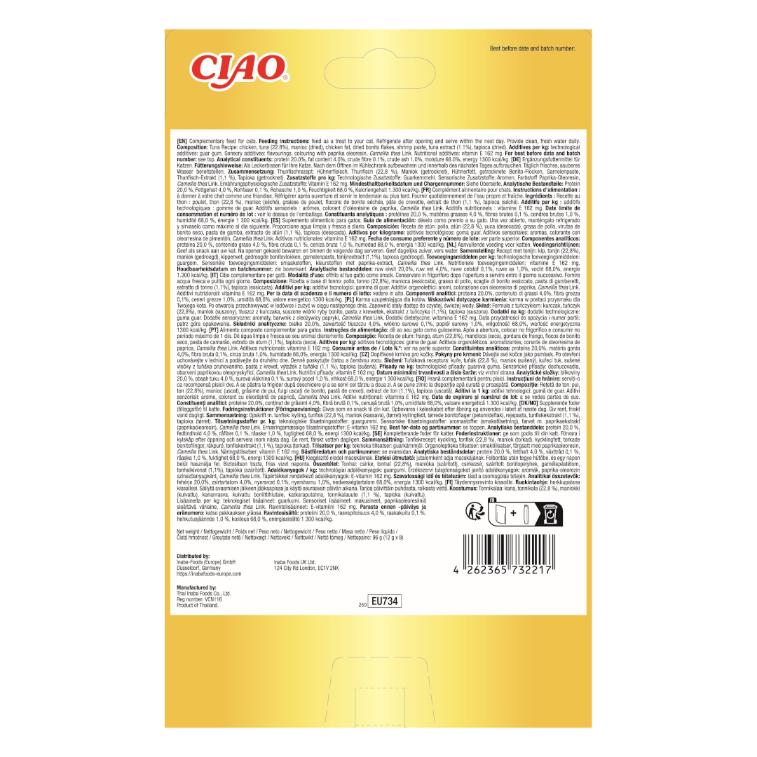 Skład: kurczak, tuńczyk (22,8%), maniok (suszony), tłuszcz z kurczaka, suszone wiórki ryby bonito, pasta z krewetek, ekstrakt z tuńczyka (1,1%), tapioka (suszona).