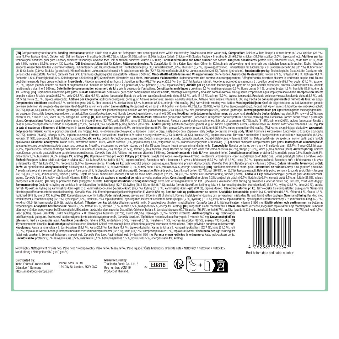 Chicken & Tuna Recipe: bulion o smaku tuńczyka (62,5%), kurczak (26,8%), tuńczyk (6,7%), tapioka (suszona).