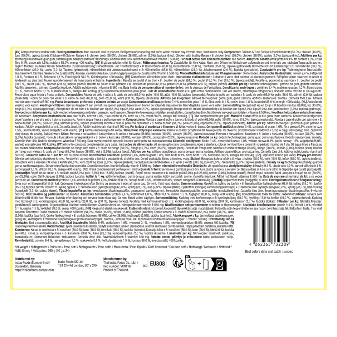 Chicken & Tuna Recipe: Bulion o smaku kurczaka (68,0%), kurczak (15,0%), tuńczyk (15,0%), tapioka (suszona).