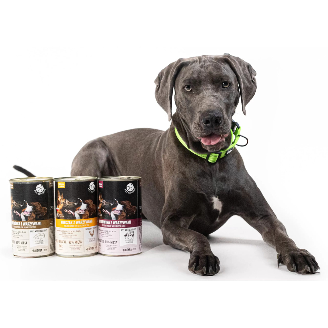PetRepublic pełnoporcjowa karma mokra, krojone kawałkami mięsa, w delikatnym sosie dla dorosłych psów średnich i dużych ras.
