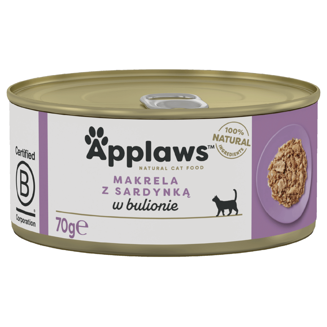 Applaws Cat makrela z sardynką w bulionie to wyśmienita propozycja dla Twojego kota, łącząca smak soczystej makreli z sardynkami, zanurzonymi w aromatycznym bulionie.