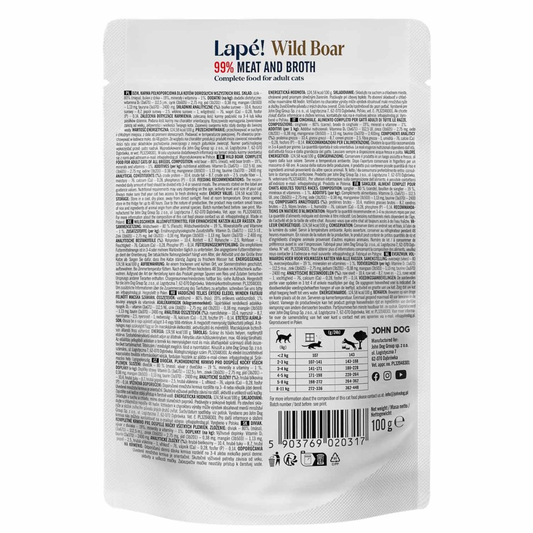 John Dog for Cats Lapé Dzik to pełnoporcjowa, wysokomięsna, bezzbożowa i hipoalergiczna karma mokra dla dorosłych kotów.