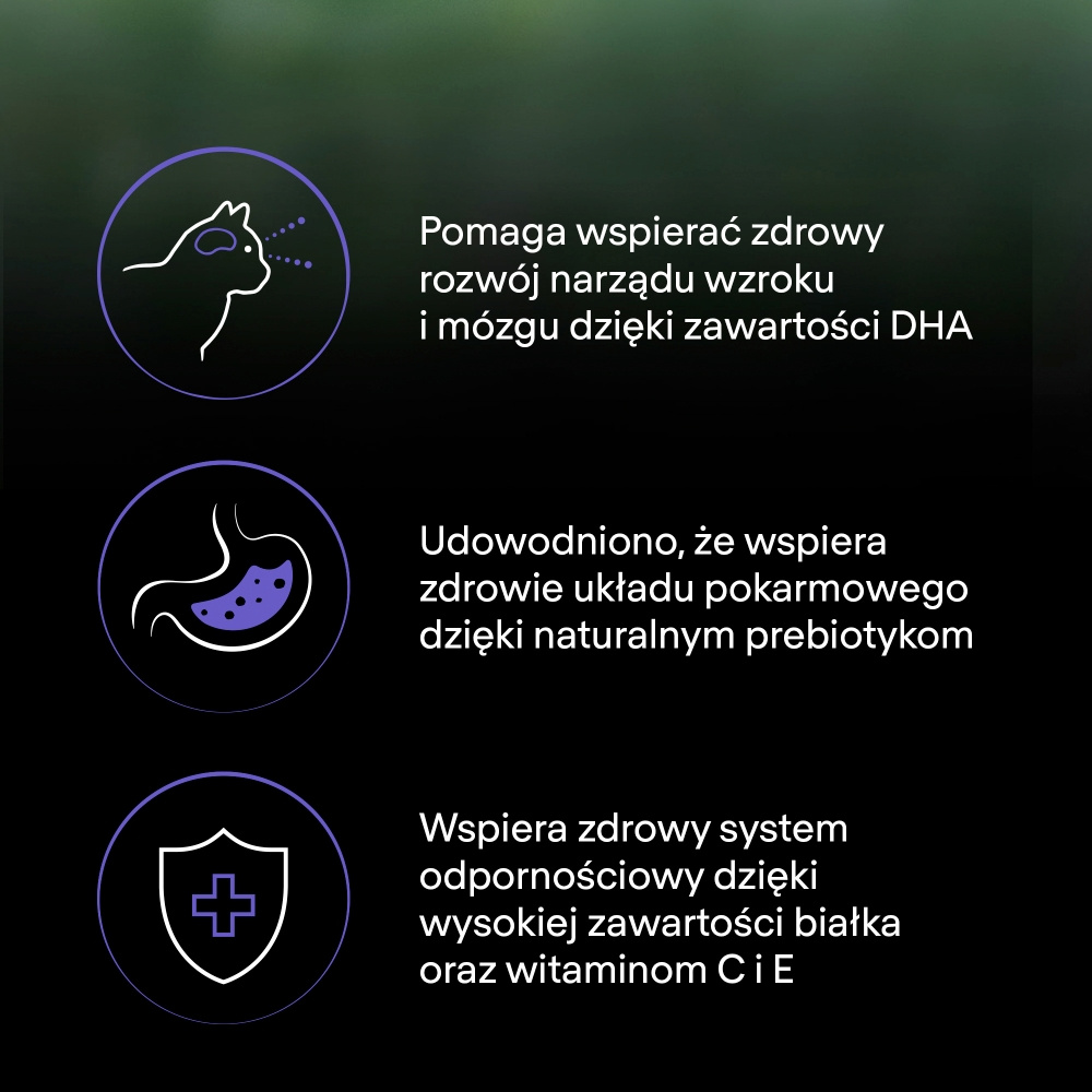Wyniki uzyskane od trzeciego tygodnia codziennego karmienia* wskazują, że produkt ten jest bezpiecznym sposobem**, aby dzięki żywieniu kontrolować alergeny kotów, a jego dodatkową zaletą jest zapewnienie doskonałego smaku i wyjątkowego żywienia dla długotrwałego zdrowia Twojego kota.