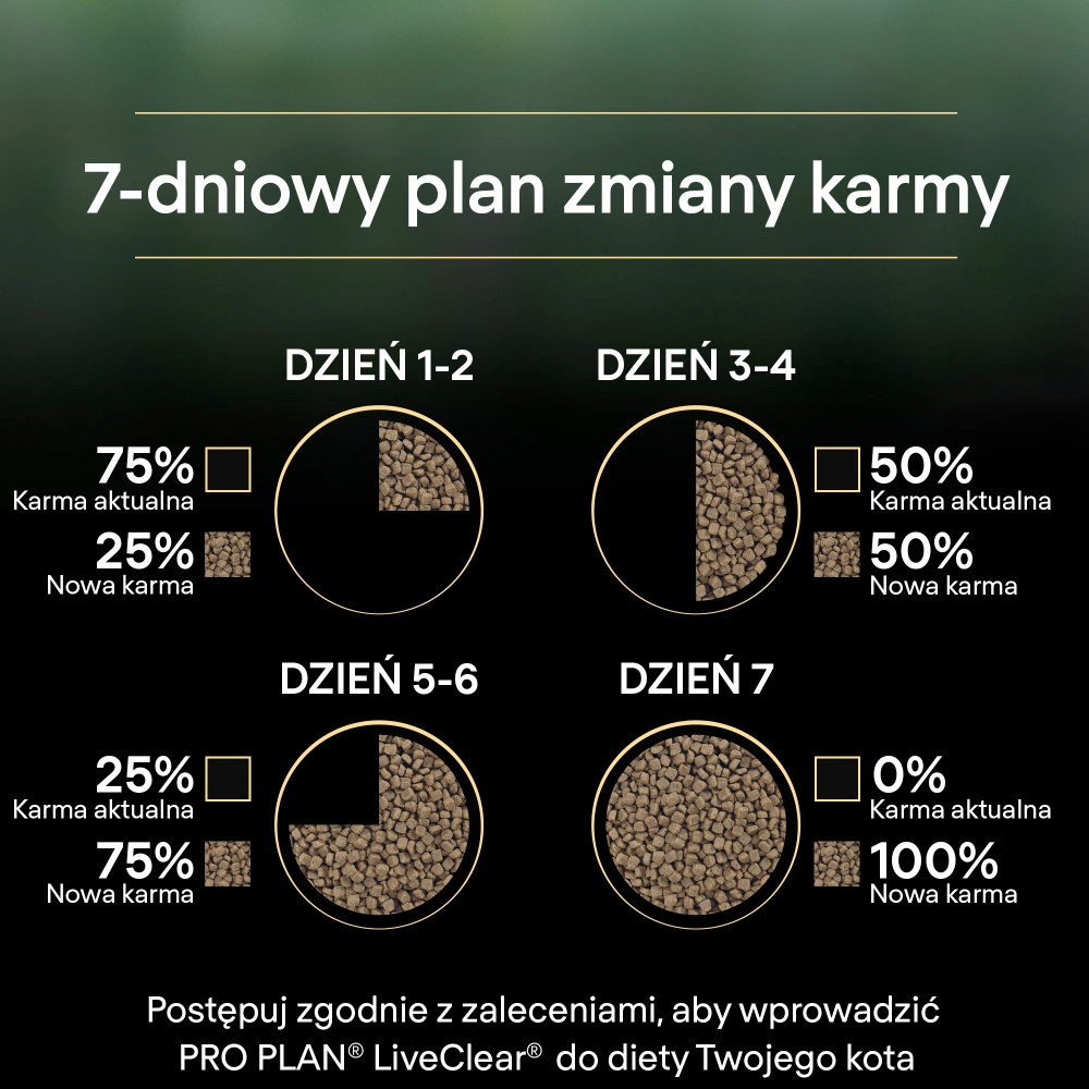 Jeśli po raz pierwszy podajesz kotu karmę PURINA ONE, zalecamy stopniową zmianę diety, zastępując stopniowo coraz większą ilość dotychczasowej karmy karmą PURINA ONE przez 7 dni, aby układ pokarmowy kota mógł przystosować się do zmiany.