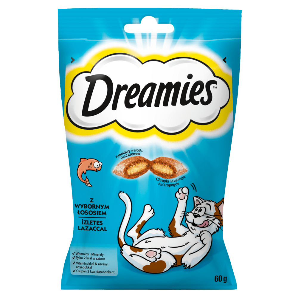 Dreamies™ o smaku wybornego łososia to wyśmienite chrupiące paszteciki z miękkim nadzieniem dla kotów powyżej 8. tygodnia życia. Ich skład został opracowany przez specjalistów ds. żywienia i lekarzy weterynarii z Instytutu Nauki o Zwierzętach WALTHAM™, dzięki czemu przysmaki Dreamies™ łączą doskonały rybny smak z odżywczym składem.