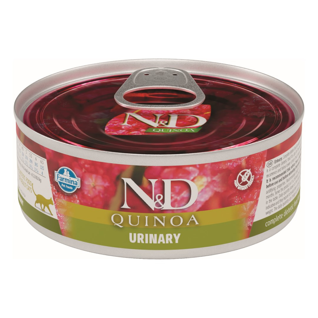 ✓ N&D Quinoa to pełnoporcjowa dietetyczna karma zalecana w celu ograniczania powstawania kamieni struwitowych i syndromu urologicznego kotów.