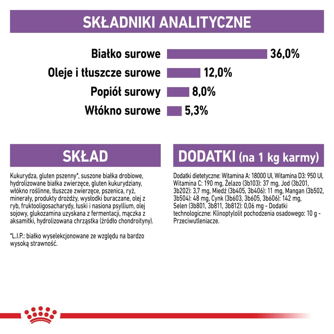 Skład: kukurydza, gluten pszenny*, suszone białka drobiowe, hydrolizowane białka zwierzęce, gluten kukurydziany, włókno roślinne, tłuszcze zwierzęce, pszenica, ryż, minerały, produkty drożdży, wysłodki buraczane, olej z ryb, fruktooligosacharydy, łuski i nasiona psyllium, olej sojowy, glukozamina uzyskana z fermentacji, mączka z aksamitki, hydrolizowana chrząstka (źródło chondroityny).