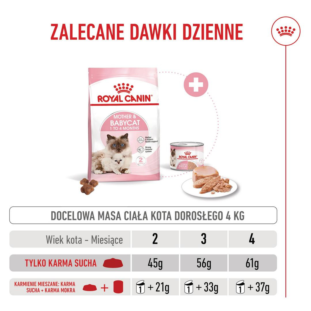 Karma ROYAL CANIN® Mother & Babycat została specjalnie dostosowana do pokrycia wysokich potrzeb energetycznych kotki w okresie ciąży i laktacji. Karma wspiera również zdrowy rozwój kociąt w okresie odsadzania, do 4 miesiąca życia.