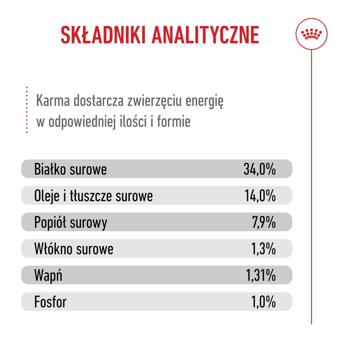 Skład: Suszone białko drobiowe, gluten pszenny*, ryż, kukurydza, mąka kukurydziana, tłuszcze zwierzęce, mąka pszenna, wysłodki buraczane, hydrolizowane białka zwierzęce, minerały, gluten kukurydziany, olej sojowy, produkty z drożdży, olej rybny, fruktooligosacharydy, łuski i nasiona psyllium, hydrolizowane drożdże (źródło mannooligosacharydów i beta-glukanów) (0,30%), olej z alg Schizochytrium sp. (źródło kwasów DHA), sok z juki schidigera, mączka z aksamitki, glukozamina uzyskana z fermentacji, hydrolizowana chrząstka (źródło chondroityny).
